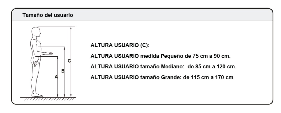 | Altura del usuario | 75 – 90 cm | 85 – 120 cm | 115 – 170 cm |