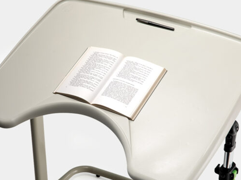 Detalle de la superficie de la mesa Ormesa con cavidad frontal y borde perimetral que evitan la caída de objetos al inclinarse. Ideal para sujetar libros, cuadernos o material escolar, ofreciendo comodidad y seguridad durante la lectura y escritura.