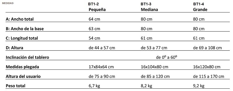 | Medidas | BT1-2 Pequeña | BT1-3 Mediana | BT1-4 Grande |