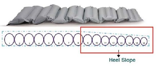 Con este colchón conseguimos el alivio de presión básico gracias a sus 16 celdas alternantes de 12,5 cm de altura. en la zona de los talones y a la inclinación decreciente de las últimas 8 celdas.