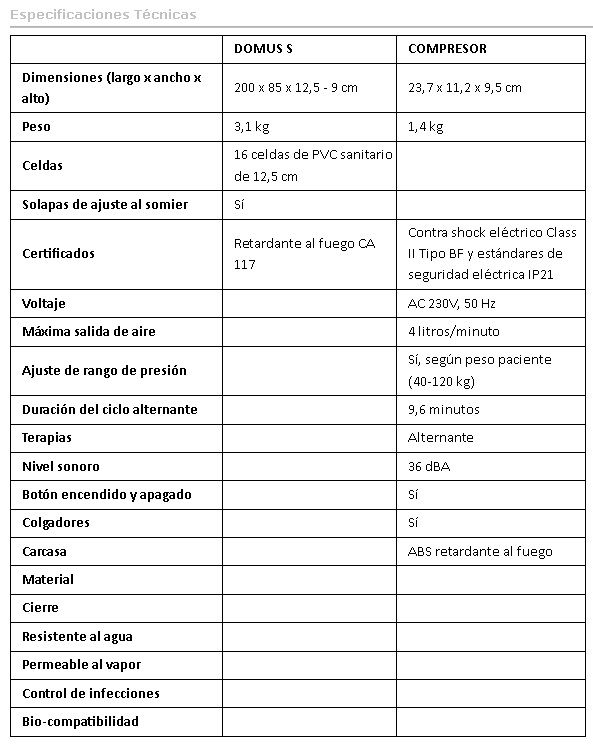 Antes denominado Domus 2s, proporciona terapia de presión alternante es decir, las celdas se inflan y desinflan redistribuyendo la presión en ciclos de 9,6 minutos y cuenta con 16 celdas de 12,5 cm de altura conforme a las últimas recomendaciones de la EPUAP (European Pressure Ulcer Advisory Panel).