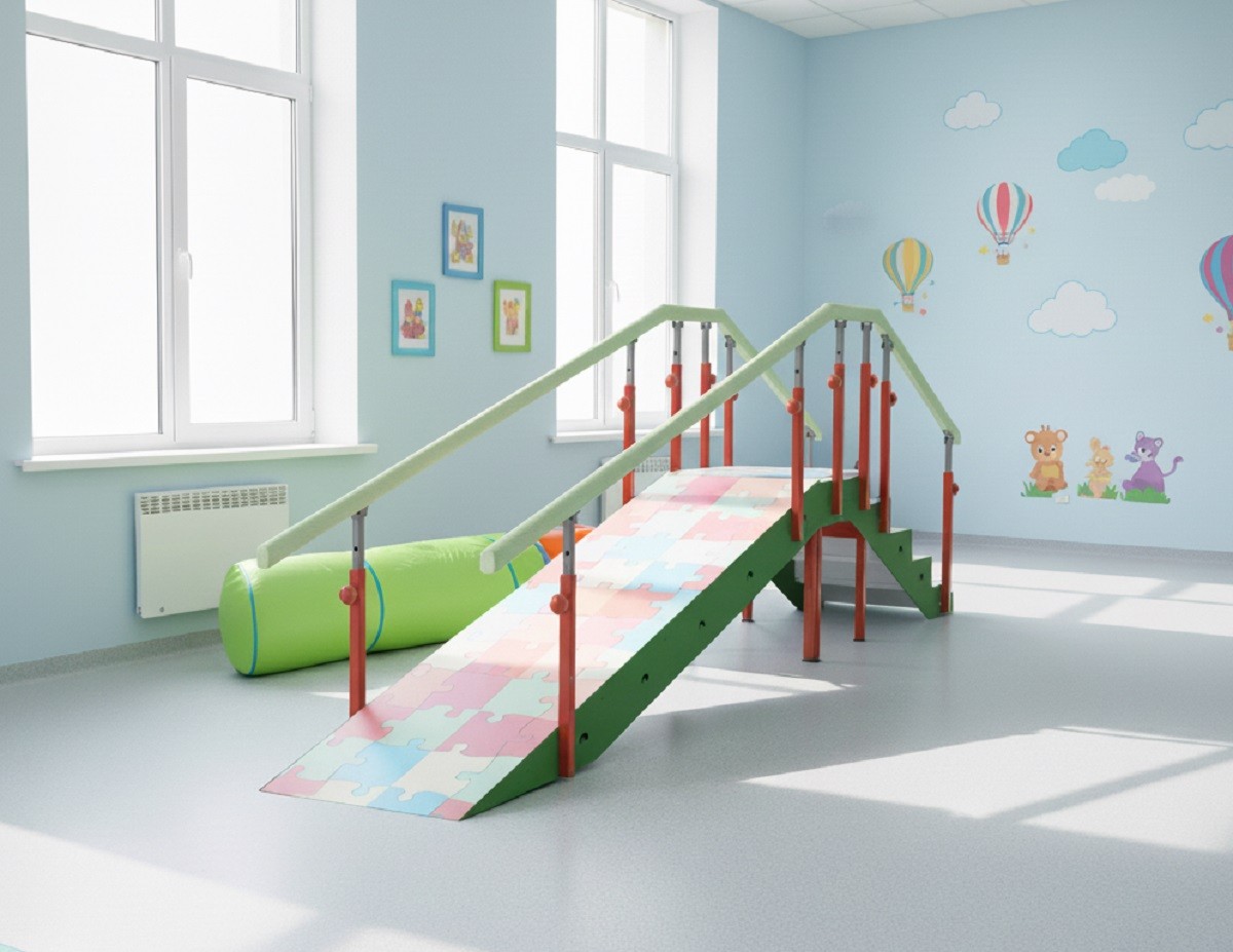 Indicada para mecanoterapia y fisioterapia pediátrica. Estructura de acero con epoxy; peldaños y descanso en melamina; rampa con motivos infantiles para aumentar la adherencia y la motivación.