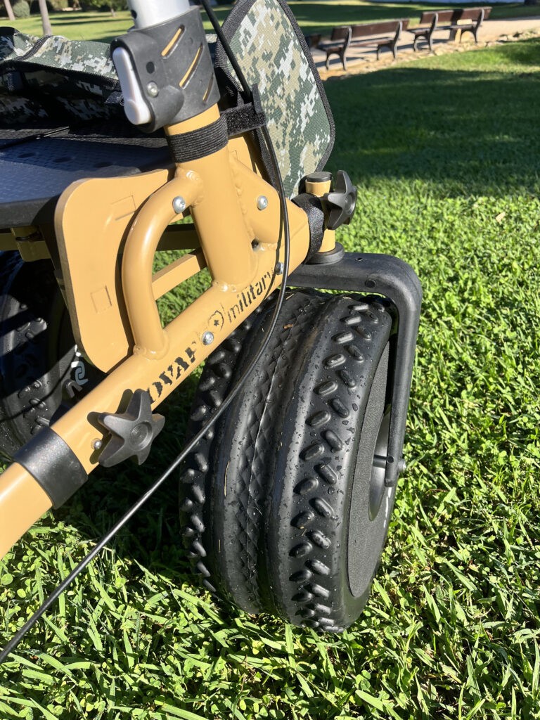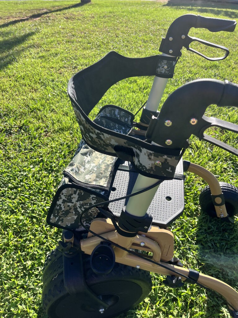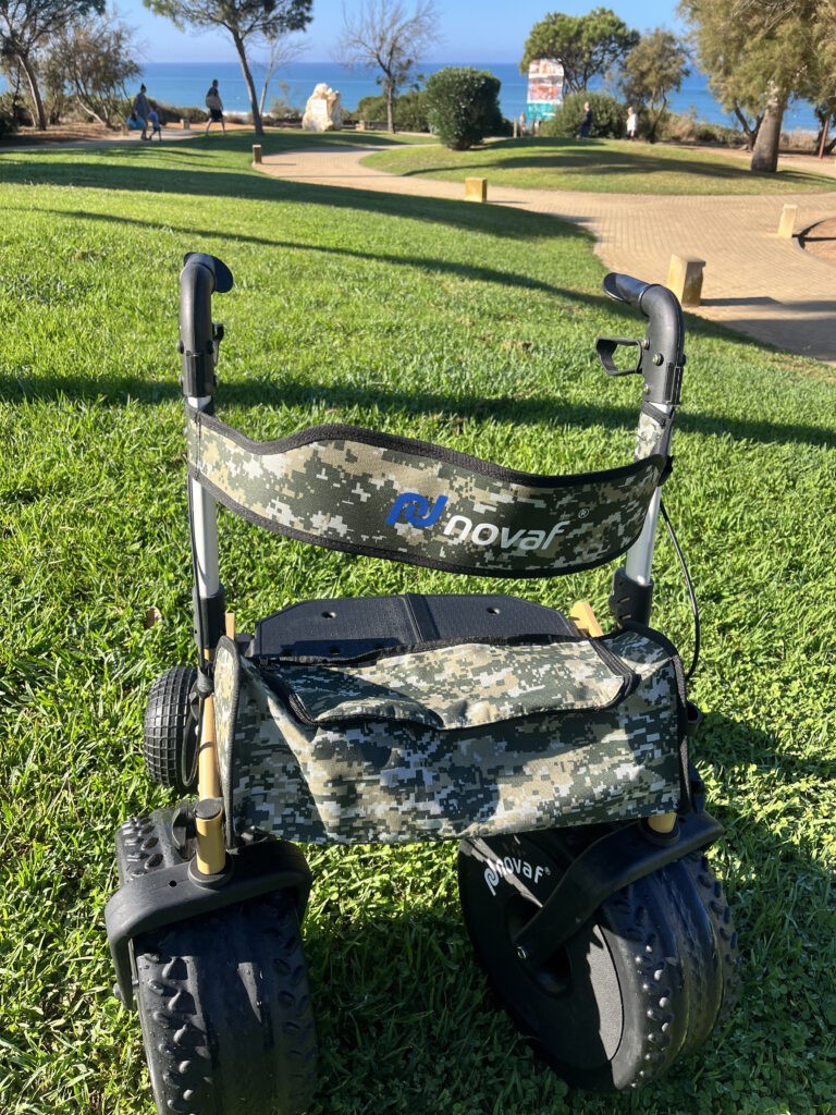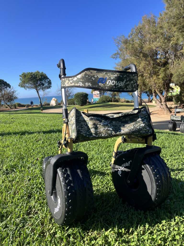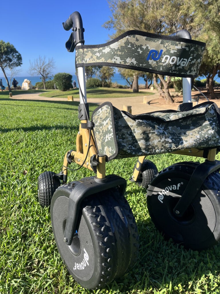 Rollator para adultos MILITARY pensado para personas mayores que quieren seguir paseando por playa, campo y terrenos irregulares con más seguridad.