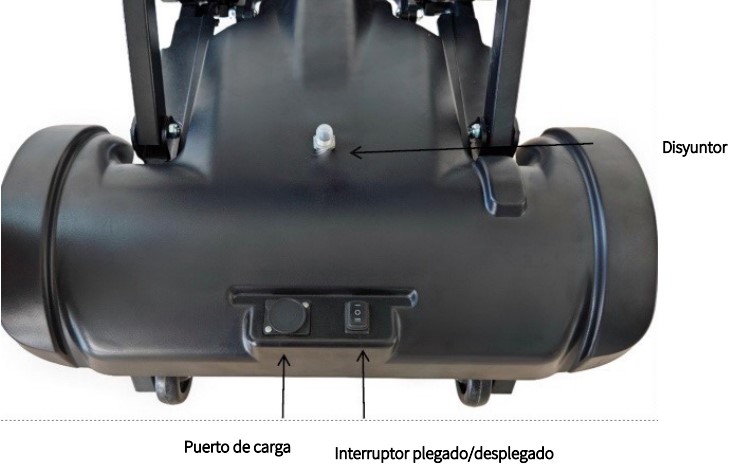 Base del scooter Wellell i-Ares con puerto de carga, interruptor de plegado/desplegado si no llevas el mando a distancia y disyuntor de seguridad. Fácil, rápido y seguro.