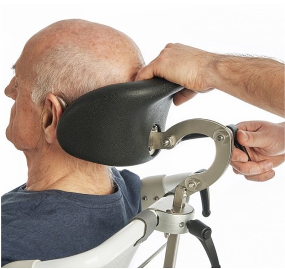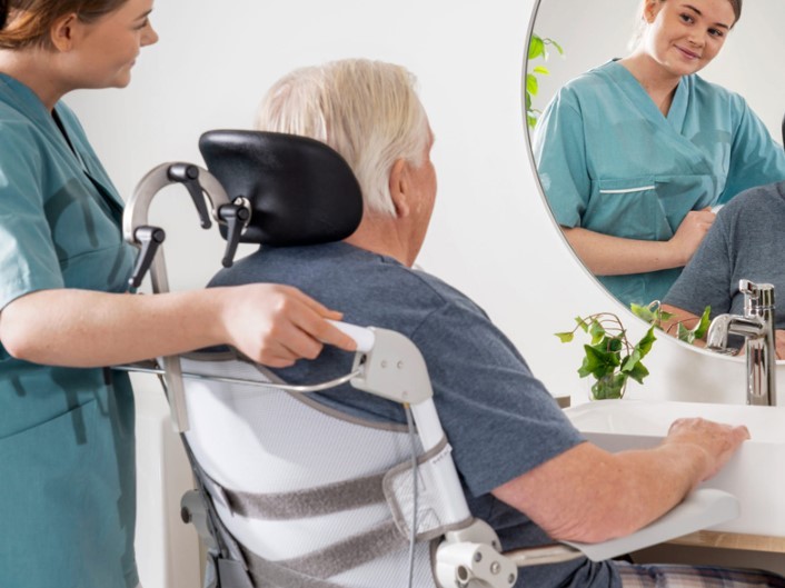 El asiento y respaldo de la silla de baño son regulables en altura y en inclinación. El control de la inclinación está situado de tal manera que el cuidador y el paciente mantienen contacto visual en todo momento, lo que contribuye a una mejor comunicación entre ambos y a crear un ambiente de confianza.