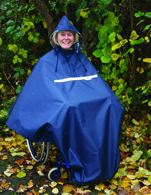 Para los usuarios de sillas de ruedas autopropulsables, recomendamos chubasqueros de nylon con capucha y mangas para permitir la total libertad de movimientos de los brazos y con las piernas totalmente cubiertas.