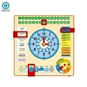 Reloj con sistema de fichas móviles (no extraíbles para evitar su pérdida), que ayudará a familiarizarse con los meses, las estaciones, el tiempo, los días, las horas y los minutos. Medidas: 44x44x3 cm.
