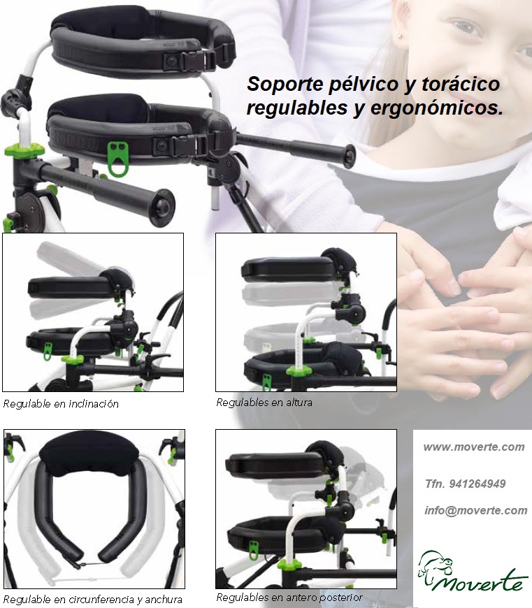 Su versatilidad, adaptabilidad y ergonomía, proporcionan seguridad, estabilidad y contención al usuario durante las fases de estacionamiento y deambulación.